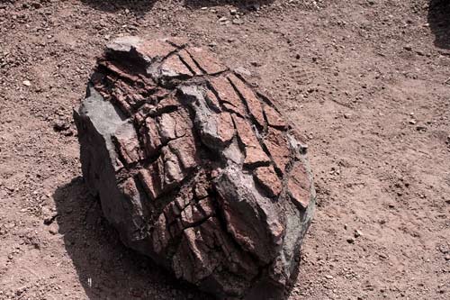 Ci-dessus, une vue à l'arrivée dans l'ancienne carrière et à droite une bombe volcanique de plus d'un mètre de long, en fuseau et craquelée en surface.
