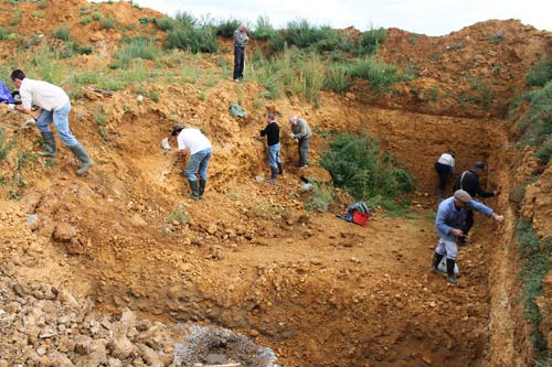 Le rendez-vous a été fixé à 10h30 sur la place de l'église de Courgains. C'est une sortie de dernière minute, en effet c'est John qui a recueilli l'information d'un chantier qui est en cours sur un terrain calcaire du callovien. Nous sommes 17 à arriver sur les lieux à la recherche de fossiles.